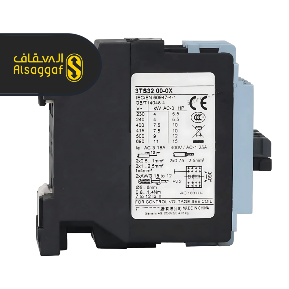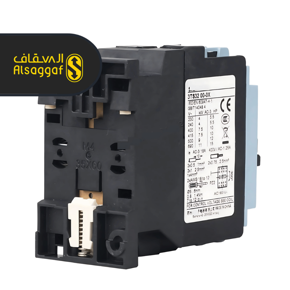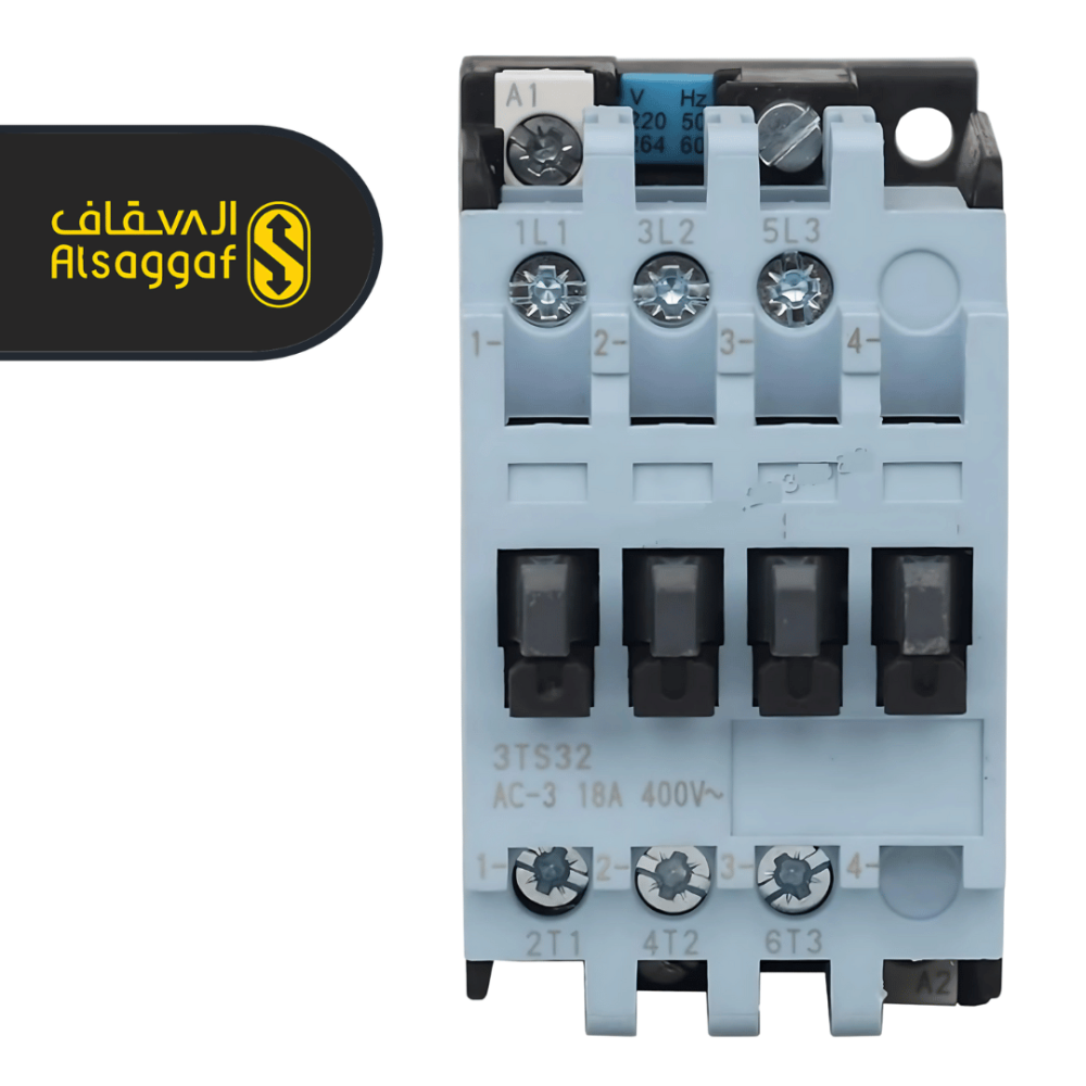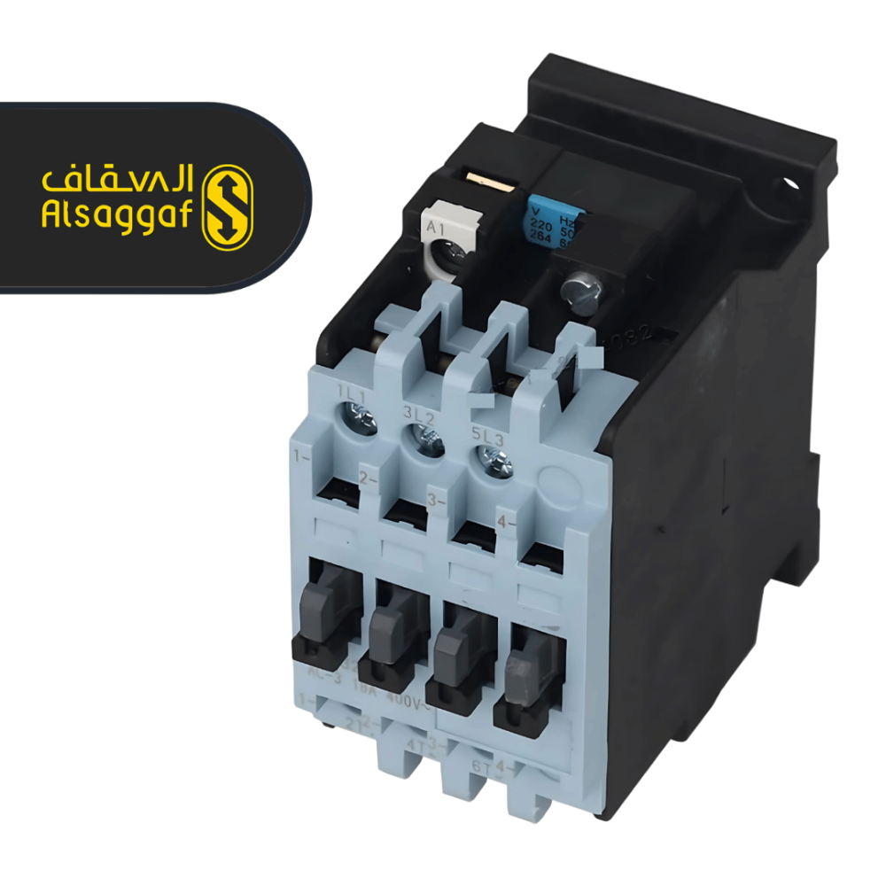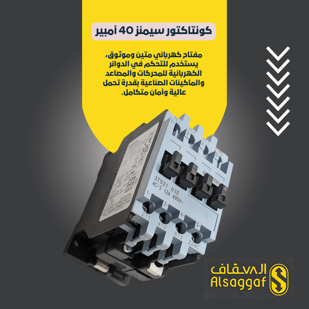 كونتاكتور سيمنز 40 أمبير، مفتاح كهربائي متين وموثوق، يستخدم للتحكم في الدوائر الكهربائية للمحركات والمصاعد والماكينات الصناعية بقدرة تحمل عالية وأمان متكامل.